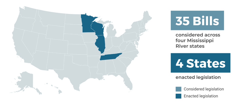 - 2024 Policy Impact: At least four Mississippi River states introduced 35 pieces of legislation to improve soil health, reduce nutrient pollution, promote sustainable agriculture, and increase flood resilience. A total of ten bills were enacted across the four states – Minnesota, Wisconsin, Illinois, and Tennessee.
