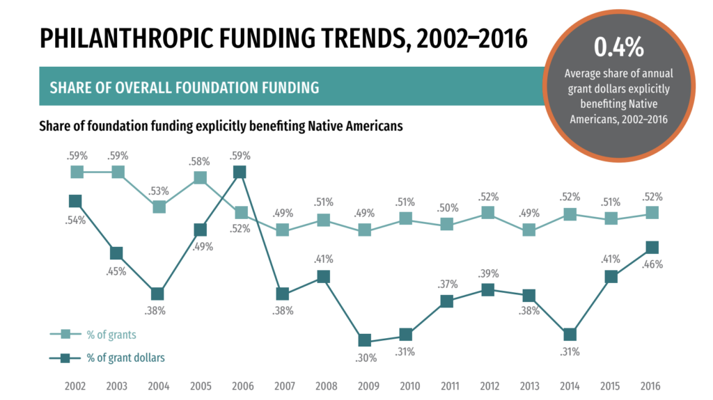 Today, roughly 0.4% of large foundation grants go to supporting Native communities and causes. Within that 0.4%, an even smaller fraction goes to Native environmental conservation efforts. Ironically, Indigenous cultures are “rooted in generosity, respect, responsibility, partnership, and reciprocity,” and such qualities are what made “survival possible for the many waves of colonial settlers who came to this land.” Indigenous Peoples are the original philanthropists, yet many Native communities have been forced to become “islands of poverty in a sea of wealth.”