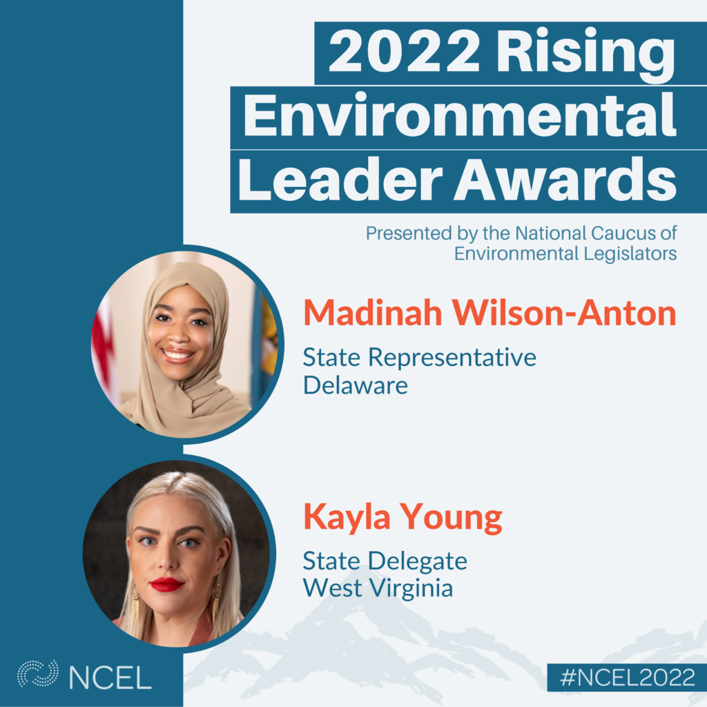 Recipients of the 2022 Rising Environmental Leader Awards were Delaware State Representative Madinah Wilson-Anton and West Virginia State Delegate Kayla Young. The award recognizes NCEL members who demonstrate strong leadership on environmental issues early in their legislative careers.
