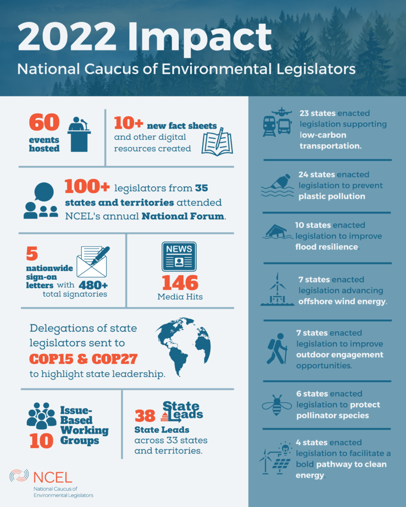 2022 was a year of continued growth and expanded impact for the National Caucus of Environmental Legislators. The NCEL team grew its capacity to work as the remote environmental staff for state lawmakers, and states across the country saw another year of strong environmental progress. Below is a recap of NCEL’s 2022 impact, some of the year’s state legislative victories, and what to expect in 2023.