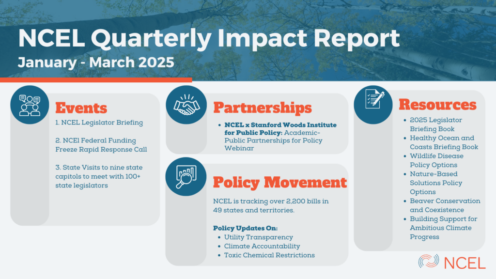 - NCEL Federal Funding Freeze Rapid Response Call: On March 18, NCEL Climate and Energy Program Manager Ava Gallo organized a briefing designed for state legislators to learn about ways to use their power to support their communities. Attendees heard from Lawyers for Good Government on how to protect existing funding programs.