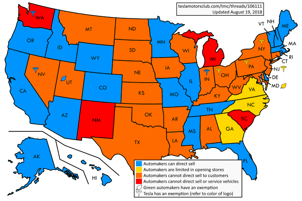 Traditional car manufacturers, like Ford and GM, didn’t initially produce the array of alternative fuel vehicles they have on the market now. For a while, boutique developers like Tesla were leading the way in EV manufacturing. However, the franchise model for selling cars, where dealerships act as the middle-man between the manufacturer and the consumer, limited Tesla and other’s reach into the market. Dealerships were hesitant to sell cars they thought people wouldn’t buy. They also didn’t have the technical capacity to handle repair and inspection for an entirely different class of vehicle. Efforts to skip the middle-man by Tesla were also met with legal roadblocks since many states have laws that make direct sales by any car manufacture illegal – a protective holdover from the great depression. Where it could, Tesla was limited to setting up its own storefronts in a handful of states that allowed direct sale.