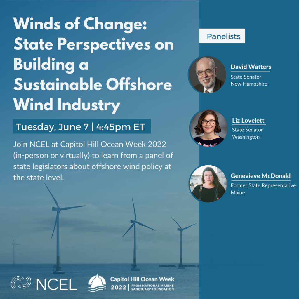 Join NCEL at Capitol Hill Ocean Week (CHOW) to learn from a panel of state legislators about offshore wind policy at the state level. State legislators will talk about the status of the industry in their states and the importance of having a comprehensive policy framework to support the development of offshore wind. The panel will address the importance of collaboration with stakeholders, other states, and the federal government to ensure that the industry is community-driven, sustainable, and equitable.