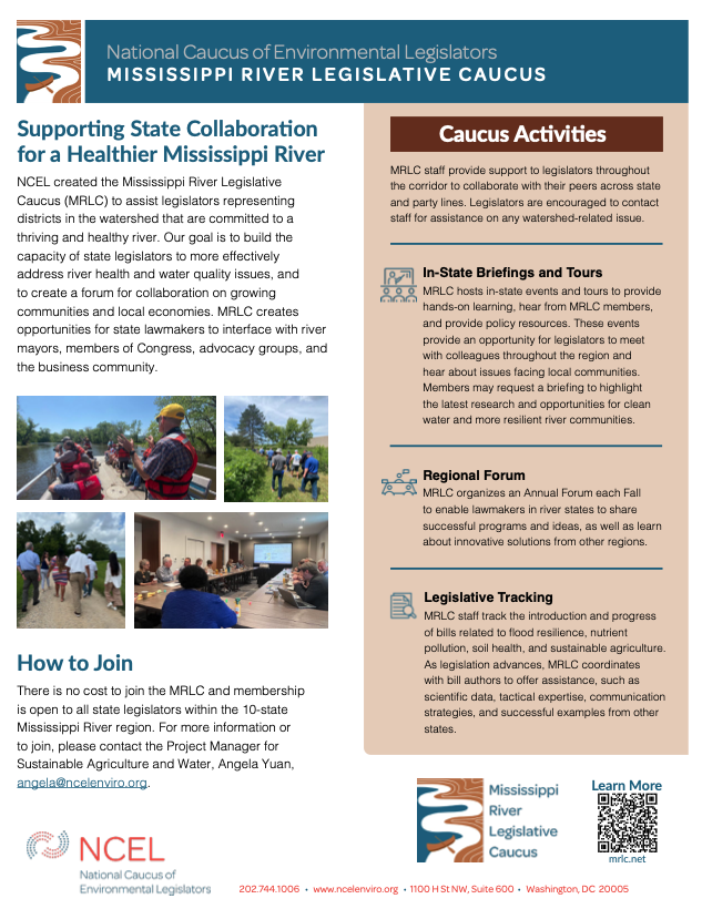NCEL created the Mississippi River Legislative Caucus (MRLC) to assist legislators representing districts in the watershed that are committed to a thriving and healthy river. Our goal is to build the capacity of state legislators to more effectively address river health and water quality issues, and to create a forum for collaboration on growing communities and local economies. MRLC creates opportunities for state lawmakers to interface with river mayors, members of Congress, advocacy groups, and the business community.