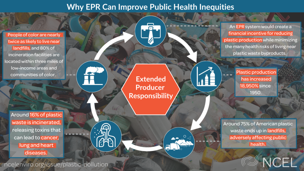 Plastic pollution is widening health inequities in the United States. The infographic below outlines how these inequities are increasing because of the plastic industry and how they could be addressed by making producers responsible for the pollution they create with Extended Producer Responsibility (EPR) programs. This infographic is available for download.