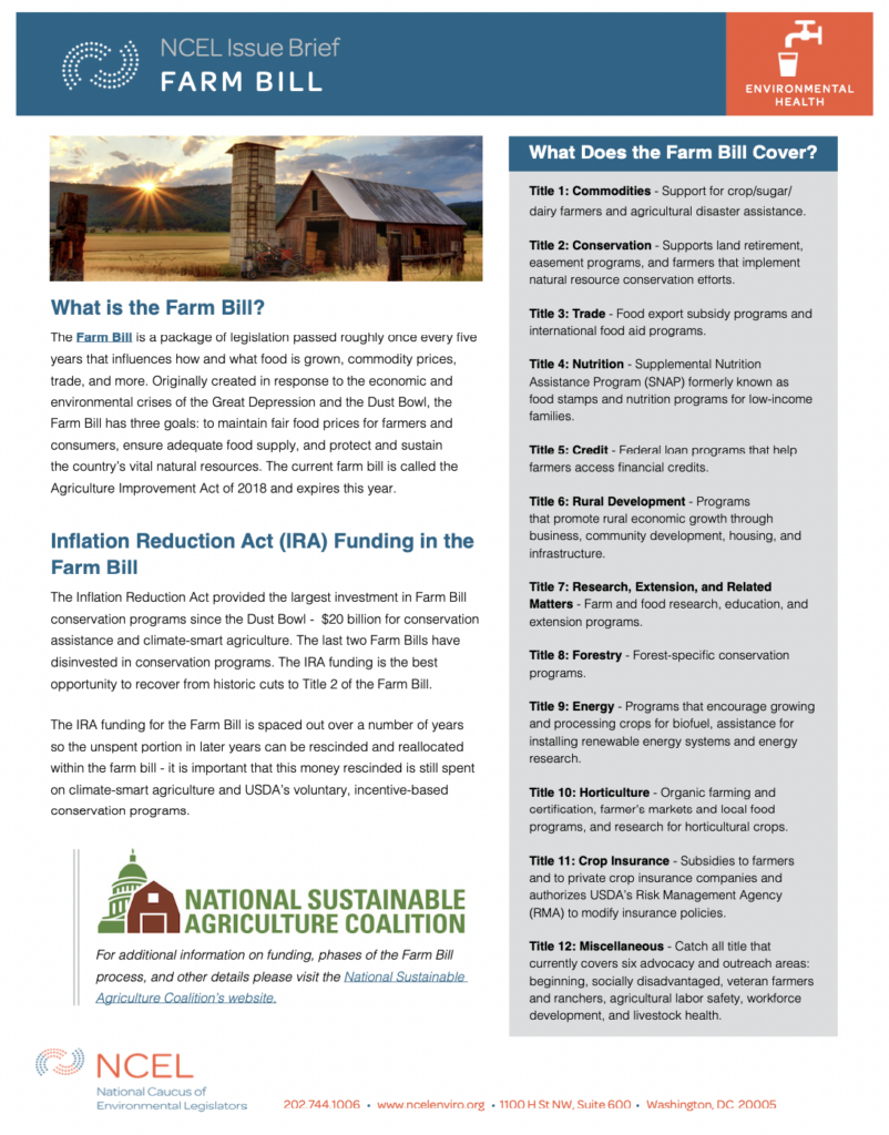 This Issue Brief is intended to give an overview of the Farm Bill, a package of legislation that influences how and what food is grown, commodity prices, trade, and more. The full Issue Brief includes the Inflation Reduction Act's (IRA) funding for the Farm Bill and more information about what areas the Farm Bill covers.