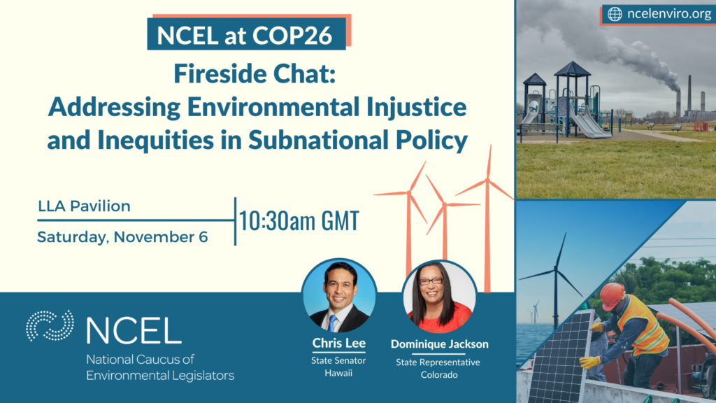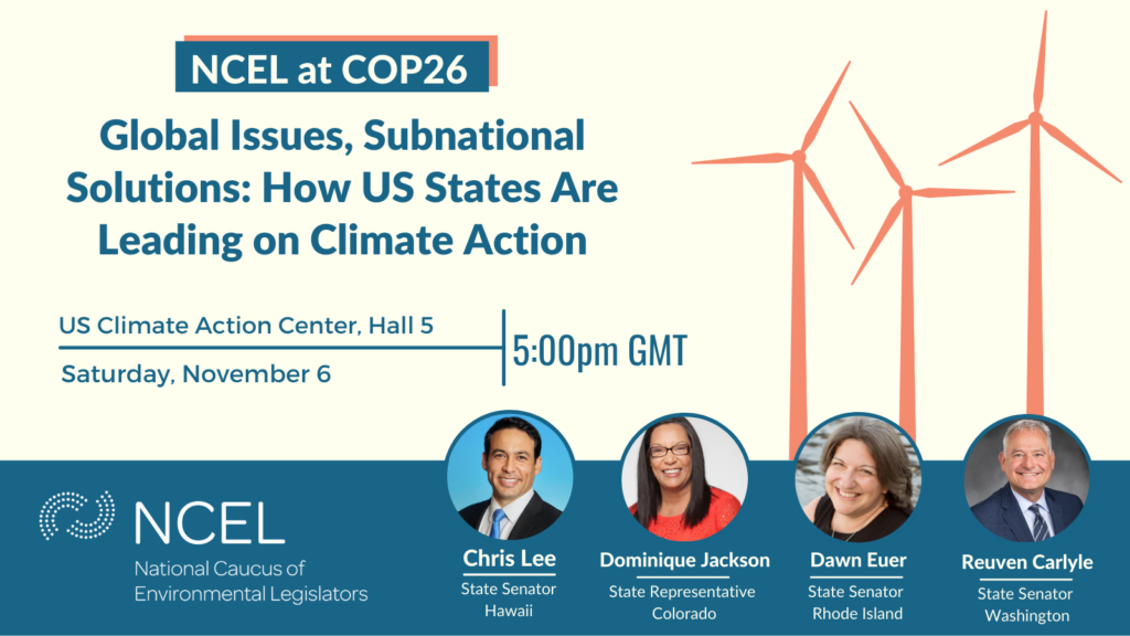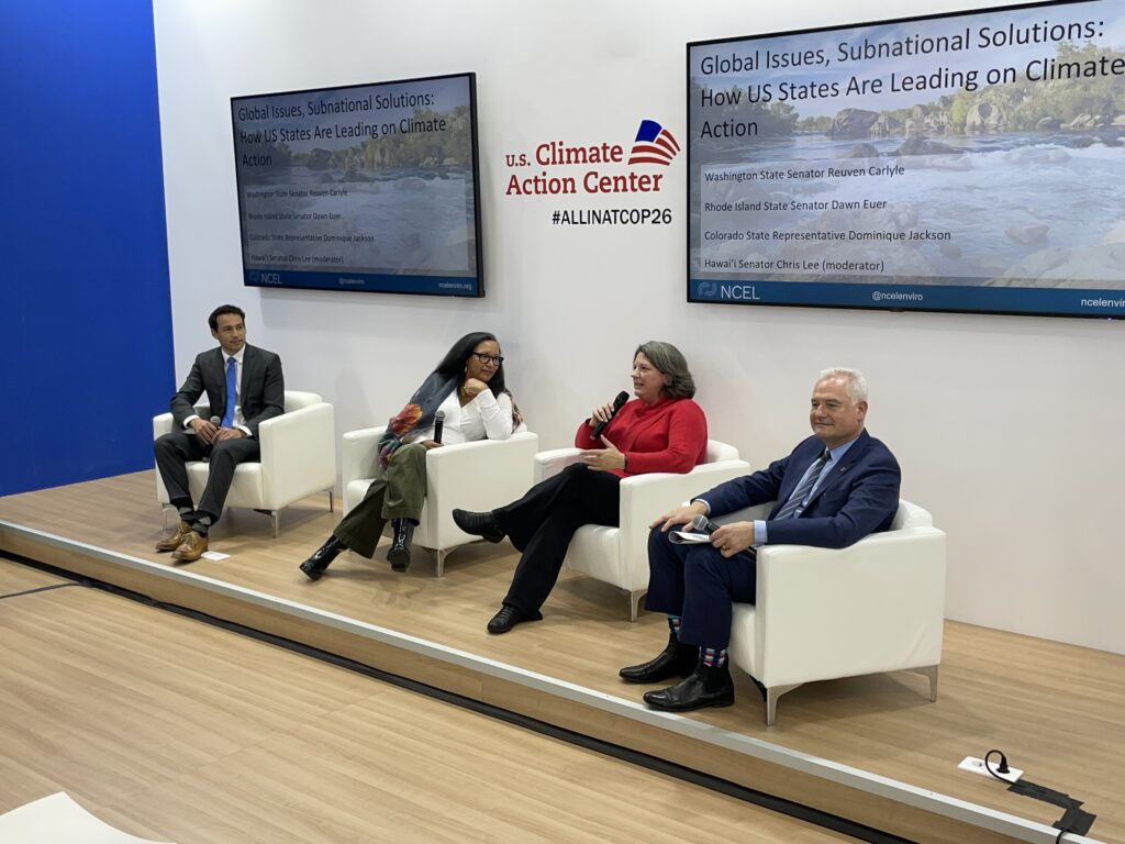 Later in the day, NCEL hosted a panel discussion at the America is All In Pavilion, focused on the crucial work of states and other subnational entities in decarbonizing and transforming their system. Sen. Lee and Rep. Jackson were joined by RI Sen. Dawn Euer and WA Sen. Reuven Carlyle. They discussed how state legislators can be more nimble and bold in their policy work compared to Congress and can create models and prove the effectiveness of policies for the federal government to adopt. And even when Washington, DC does allocate budget or create goals, it is usually up to the states to implement those measures. This was NCEL’s marquee event at COP26 and you can watch it online.