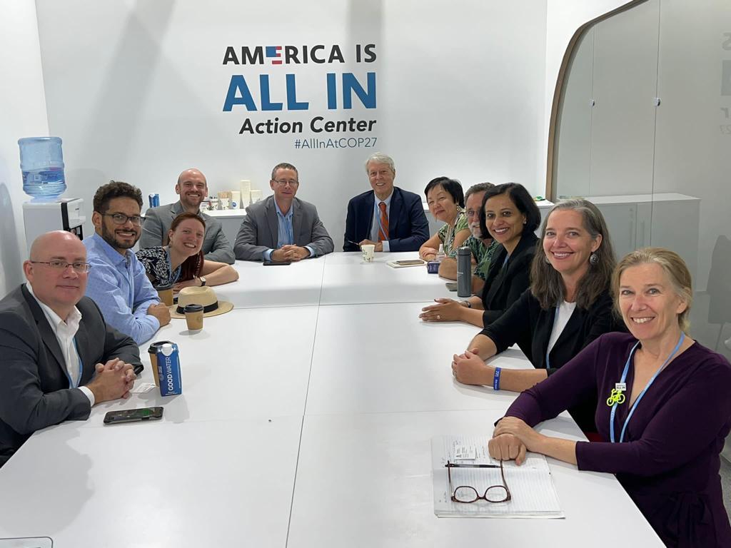 During our final full day at COP27, NCEL joined the ICLEI mayoral delegation to meet with Council on Environmental Quality (CEQ) Chair Brenda Mallory. NCEL delegation members spoke with Chair Mallory about the Biden Administration’s efforts to improve considerations of climate in infrastructure and permitting, general infrastructure needs throughout the U.S., and strategies for increased communication between subnational governments and the federal government in the U.S.