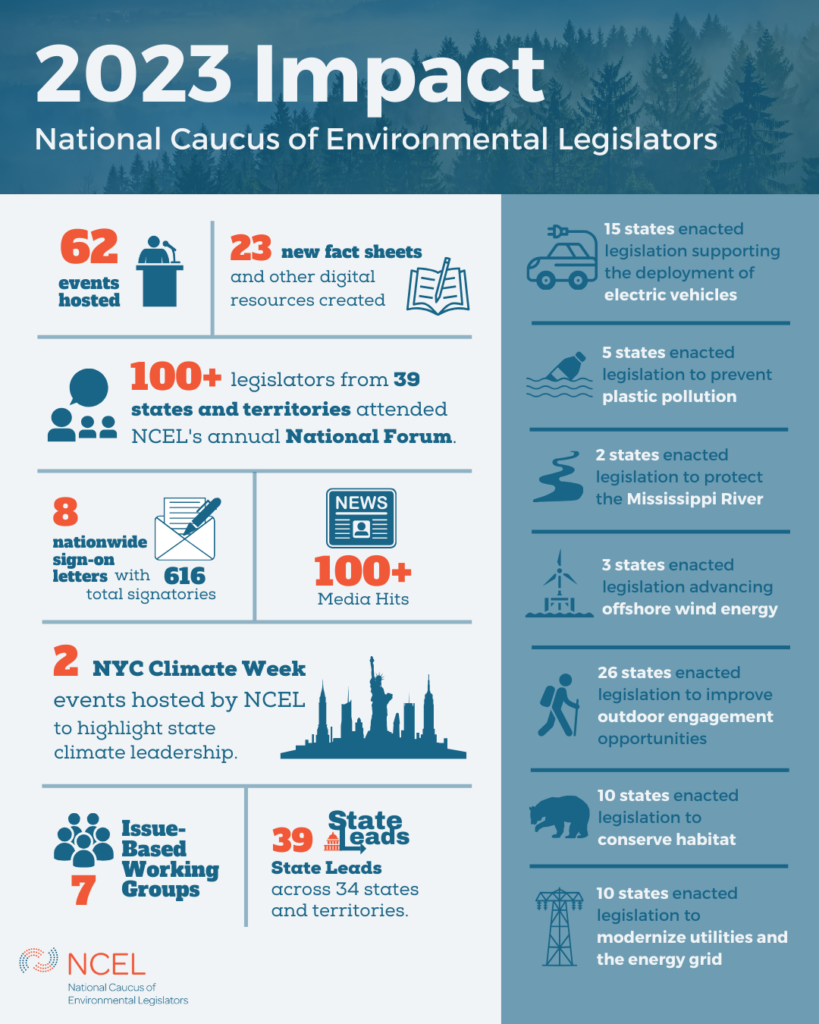 Throughout 2023, NCEL saw growth and expanded impact as the go-to organization for state lawmakers seeking to learn and collaborate on environmental policy. Thank you to state legislators across the country for your commitment and dedication to environmental solutions. Below is a recap of NCEL’s 2023 impact, some of the year’s state legislative victories, and what to expect in 2024.
